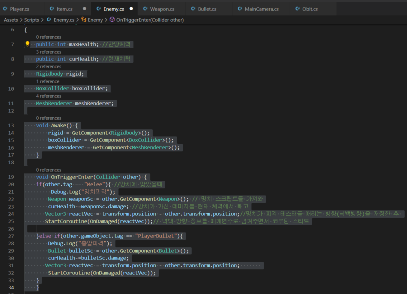 - Enemy 스크립트를 만들어서 피격테스터에 드래그 앤 드랍