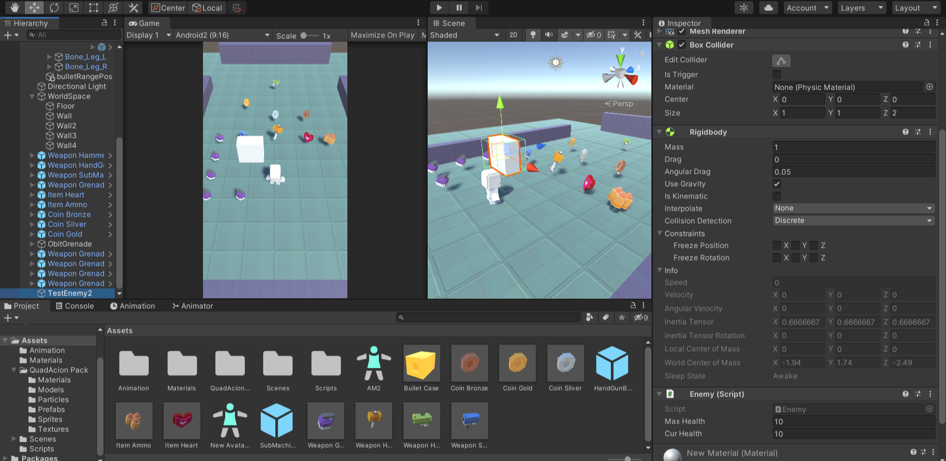 *총알 프리팹 그리고 플레이어오브젝트안의 오른팔안에 존재하지만 비활성화 되어있는 망치오브젝트 3개 모두 isTrigger를 체크해줘야함