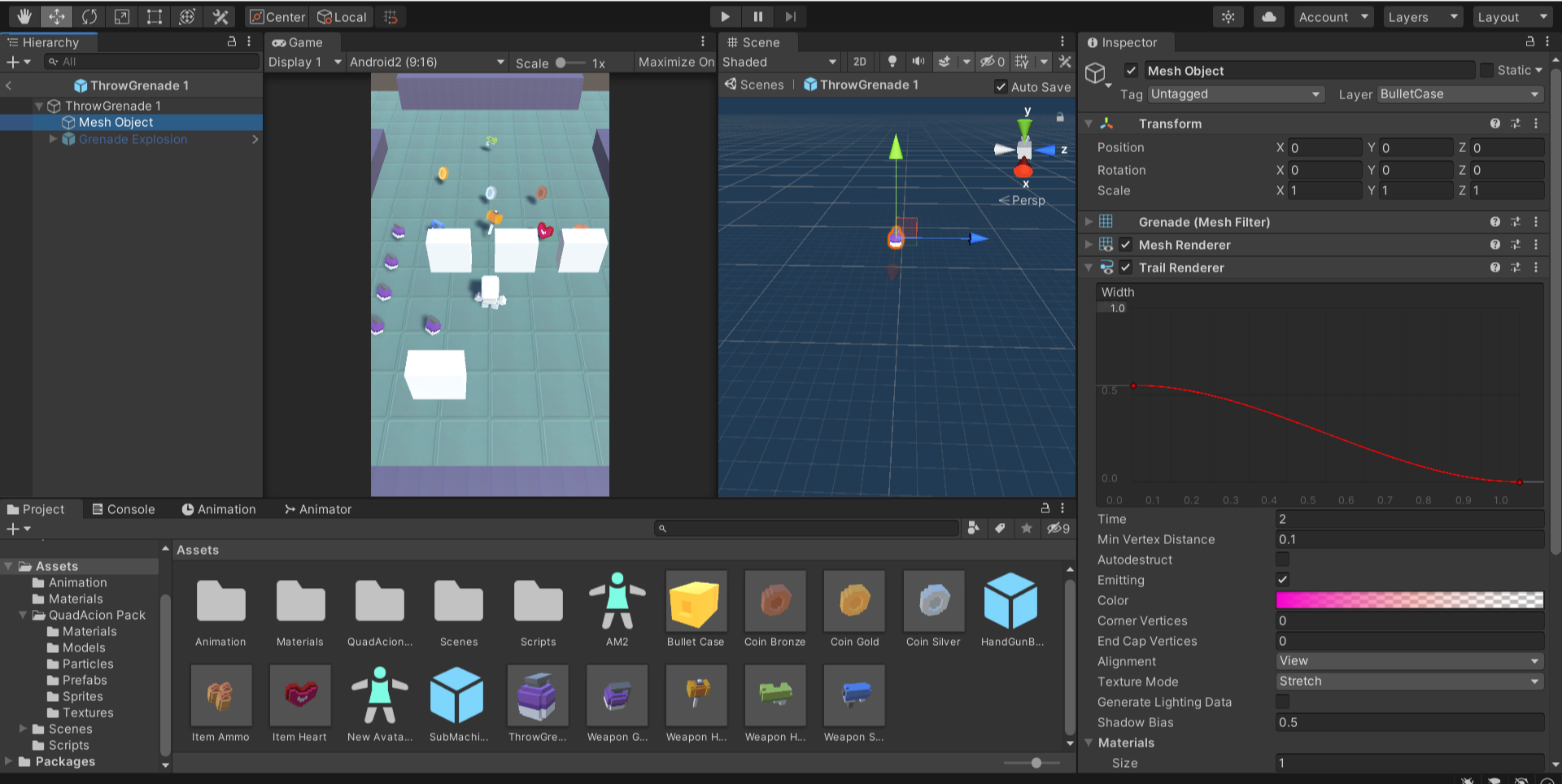 : 수류탄자체는 중력의 영향을 받으며 충돌이 가능하고, 마찰력과 탄성력을 높혀주어 활동성을 높이고, 날라갈때 이펙트를 줄것, 그리고 폭팔하면서 폭팔이펙트,