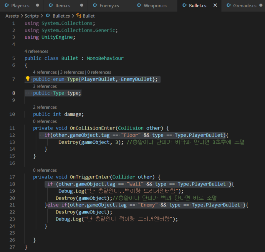 - Bullet 스크립트에서 enum Tpye 을 추가하여 플레이어총알과, 적총알 2개로 나뉘게 만듬