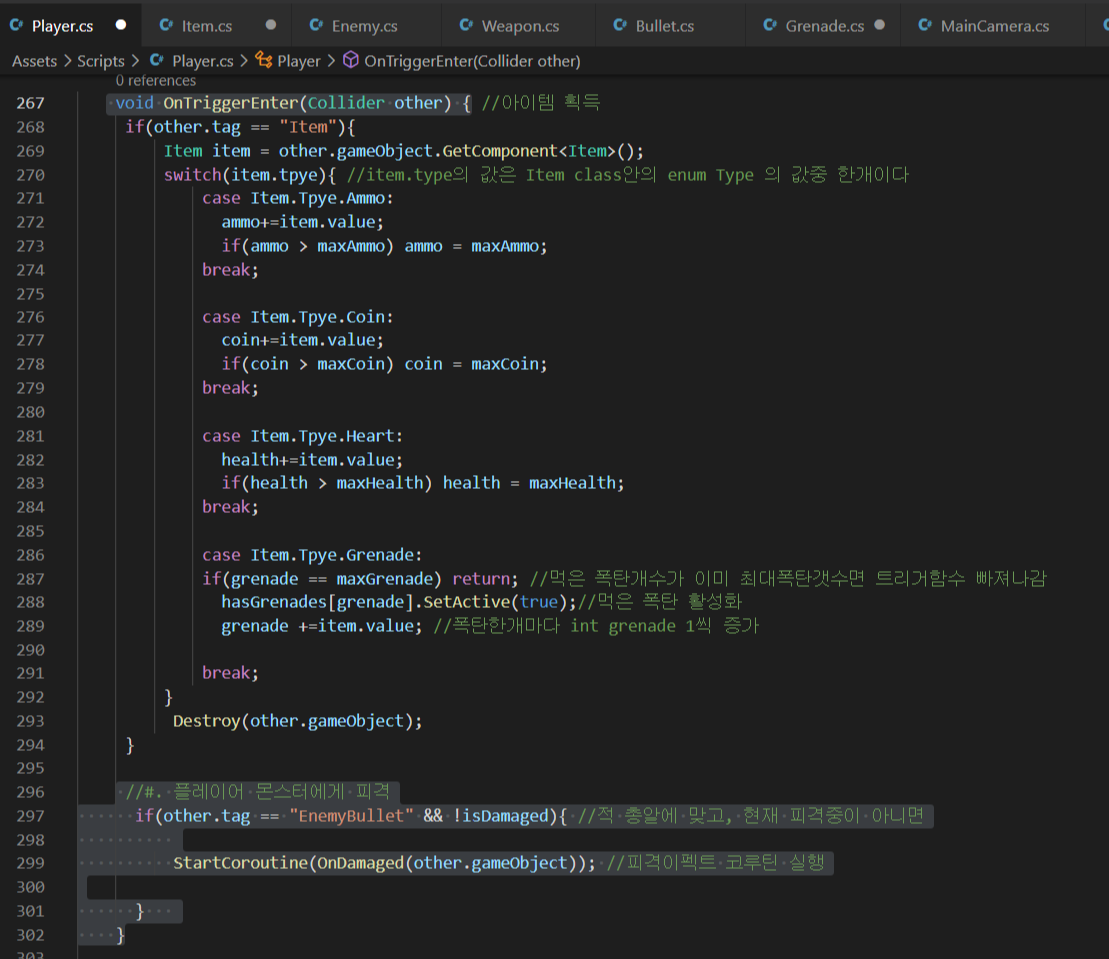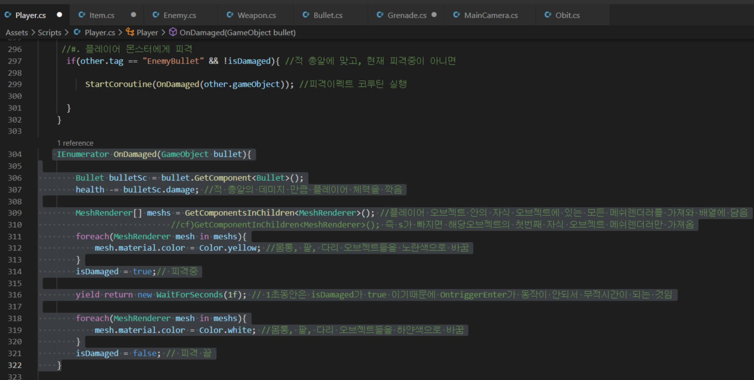 - 플레이어가 enemyBullet 오브젝트와 OnTriggerEnter가 되면 OnDamged() 함수 실행(+실행조건 : isDamaged = false)