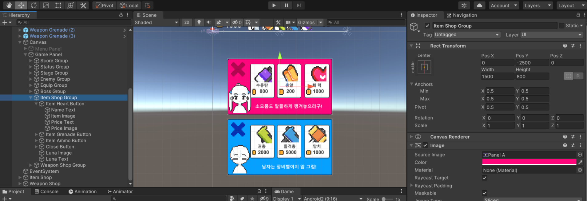 - Canvas 안에 있는 Game Panel 오브젝트 하위에 Item Shop Group이라는 빈 오브젝트를 생성하고