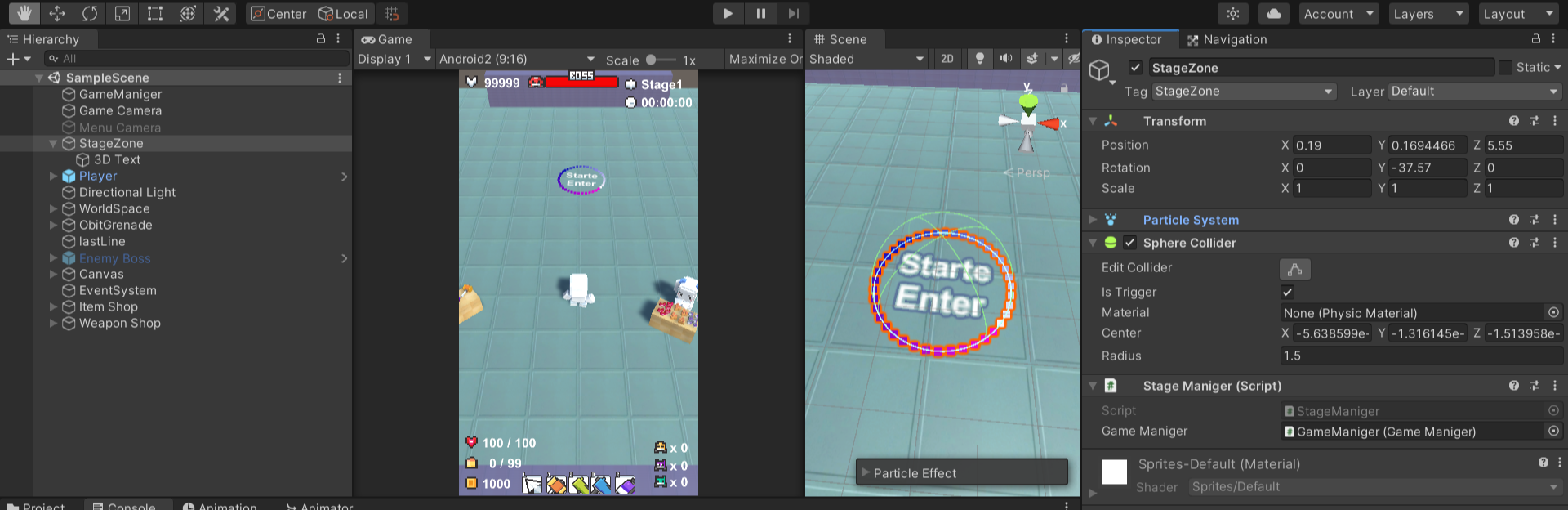 - 스테이지존오브젝트를 생성(파티클시스템와 3D Text를 이용)