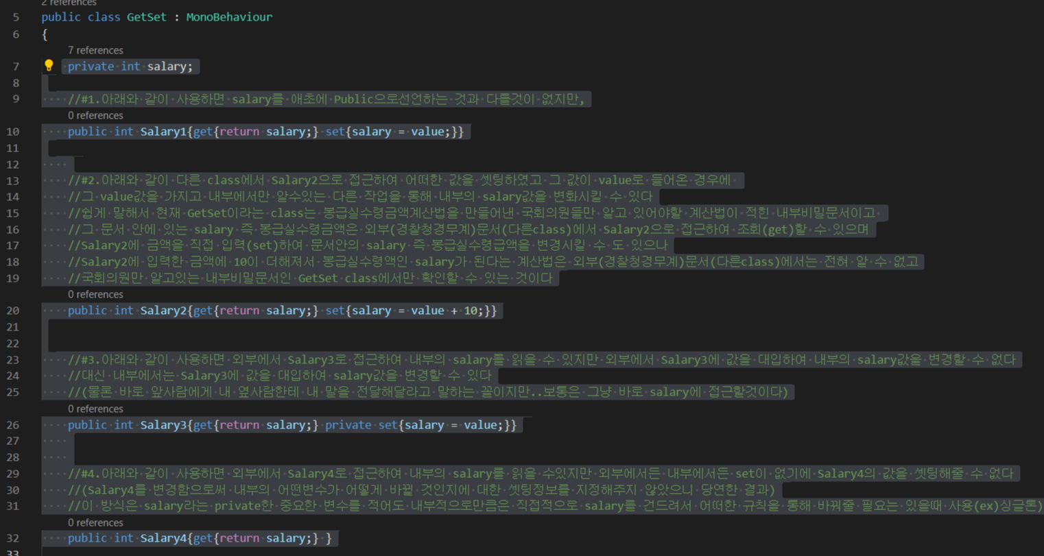 *가장 의미있게 사용하는 방식은 중요한 private변수를 대표하는 public한 상징변수를 만들어서 get; private set; 을