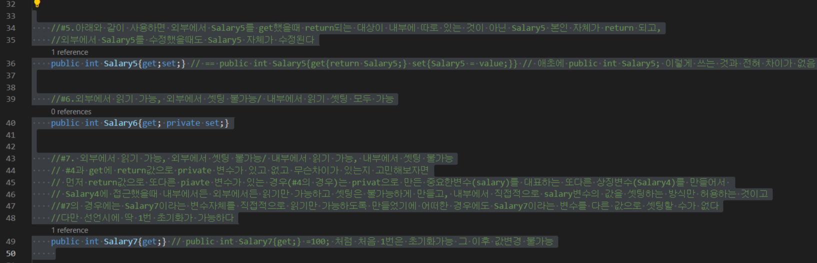 *가장 의미있게 사용하는 방식은 중요한 private변수를 대표하는 public한 상징변수를 만들어서 get; private set; 을