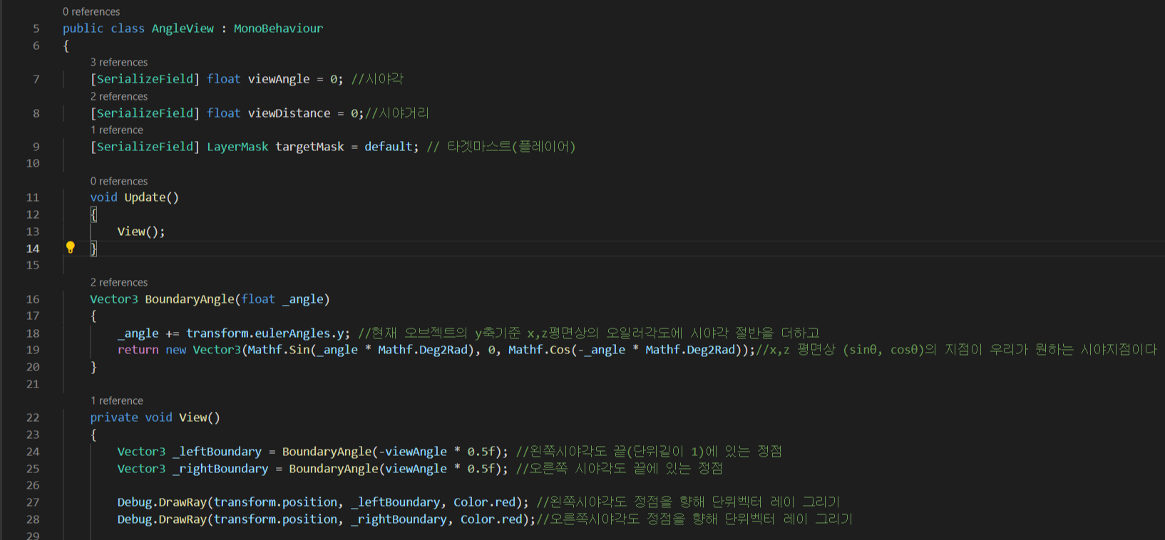 - 시야 각이 그려지는 위치인 eyeTransform.position 에서 그려지며 (Vector3 center)