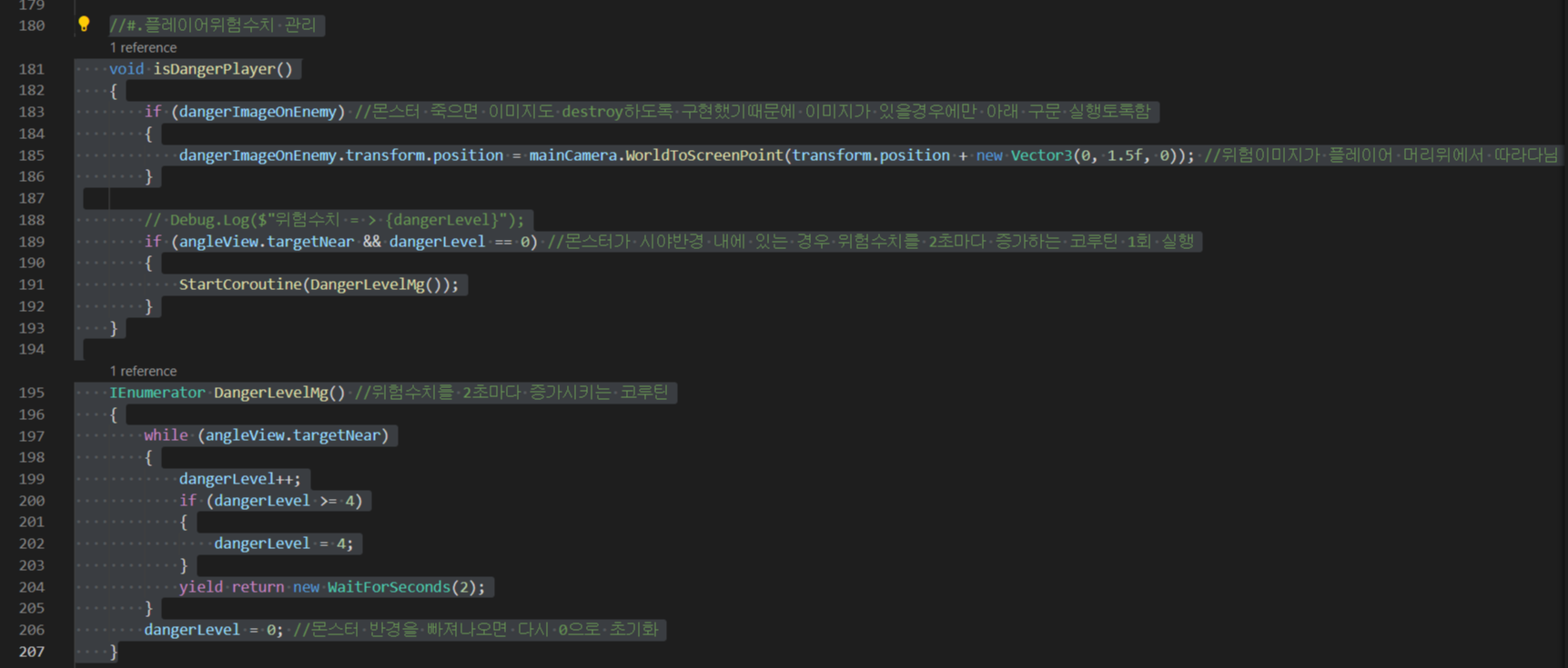 *생성한 위험도 이미지의 위치를 Camra.main.WorldToScreenPoint()를 이용하여 몬스터머리위에서 따라다니도록 구현