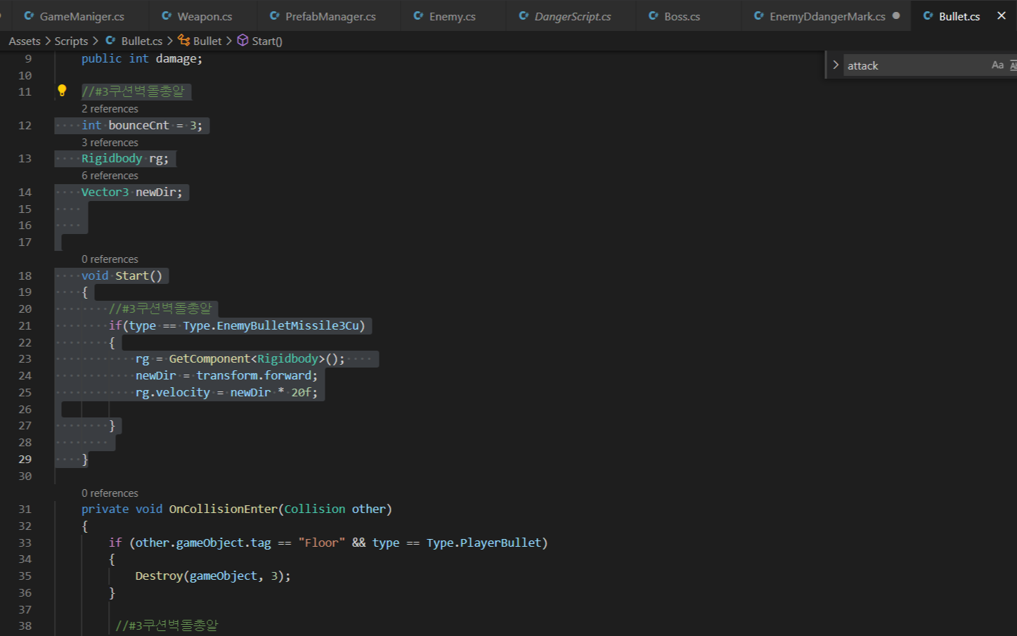 - 기존 Bullet 스크립트에서 위에서 만든 미사일 타입의 이름일 경우 먼저 생성한 총알의 forward방향으로 rigidbody.velocity를 주어 날려주고