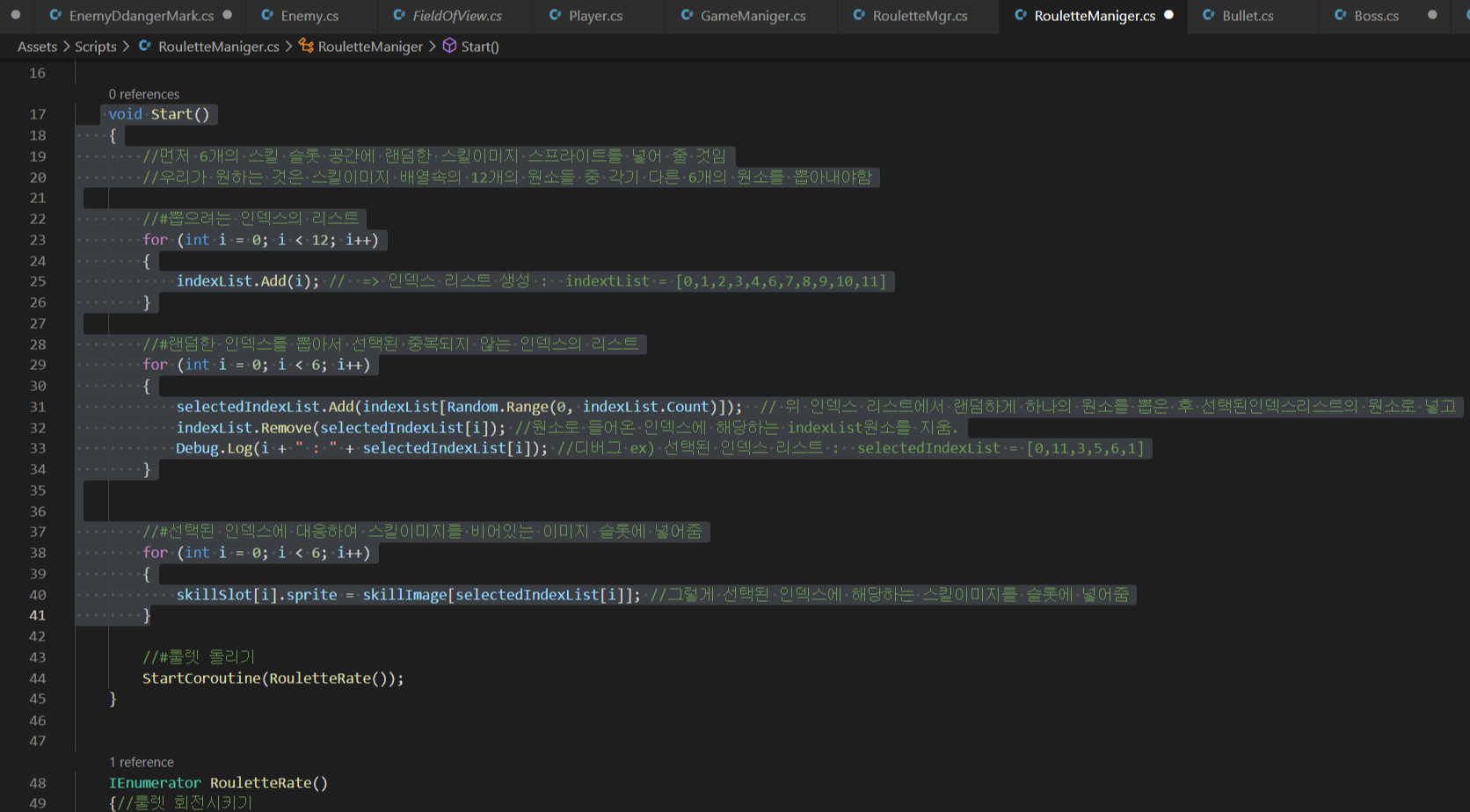 - 스킬이미지 갯수만큼의 인덱스가 들어있는 indexList를 만들고 해당 리스트에서 인덱스에 해당하는 숫자를 랜덤하게 뽑아서 selectedIndextList에 넣어주고 뽑은 숫자는 indexList에서 지워주는 로직