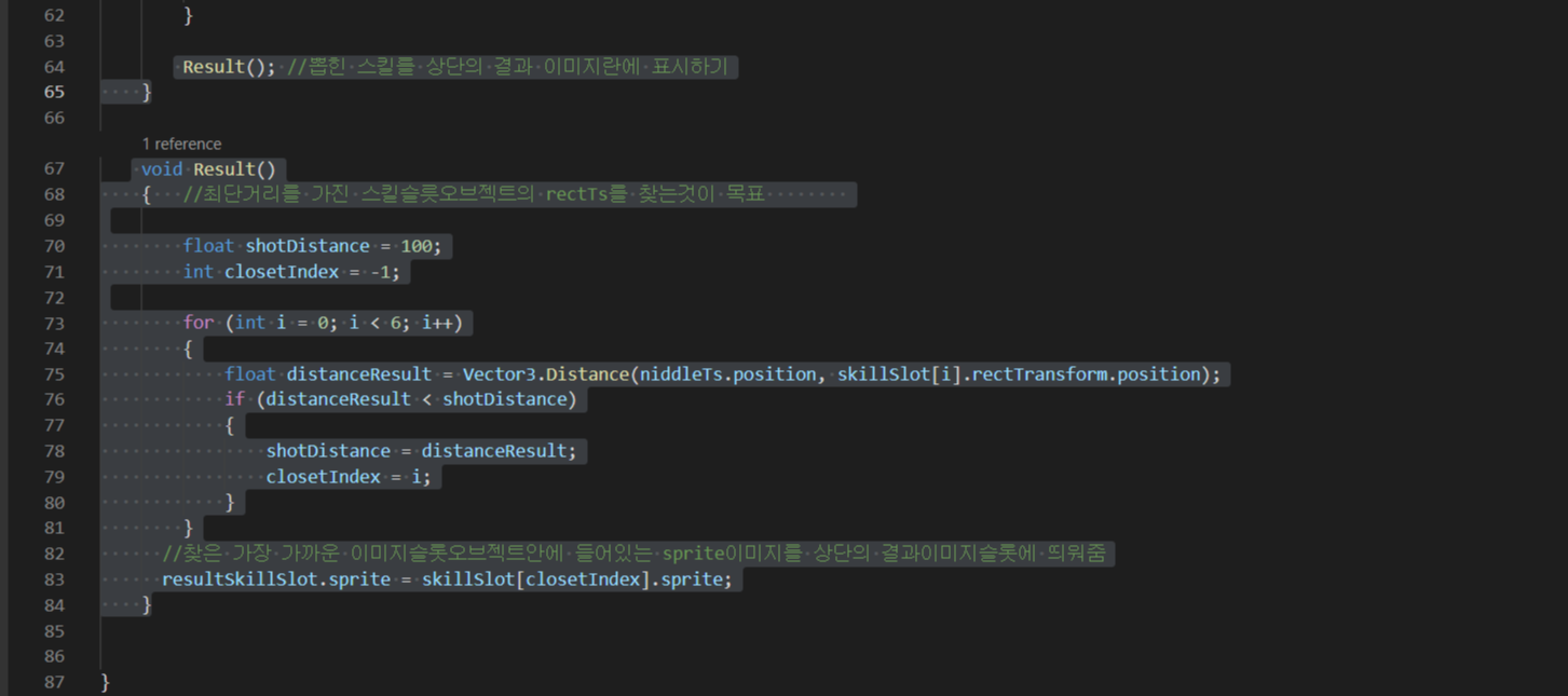 - 회전이 끝난 이 후 룰렛 바늘과 가장 가까운 인덱스i를 찾아서 해당 인덱스에 해당하는 스킬이미지를 상단 결과이미지 슬롯에 대입시켜줌