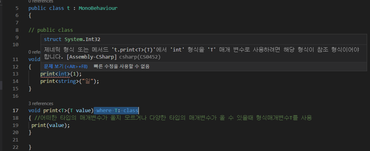- where T: 로 class 혹은 struct 등과 같이 T에 올 수 있는 형식의 제한을 둘 수 있음