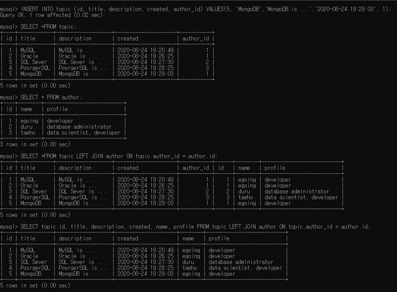 SELECT topic.id, title, description, created, name, profile FROM topic LEFT JOIN author ON topic.author_id = author.id;
