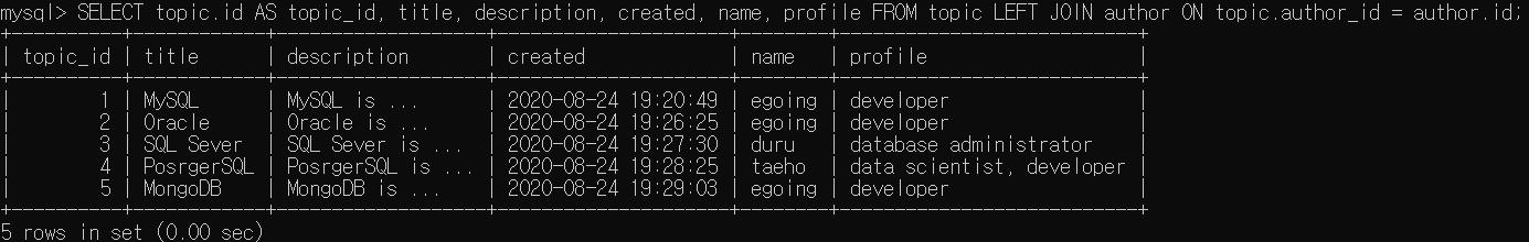 SELECT topic.id AS topic_id, title, description, created, name, profile FROM topic LEFT JOIN author ON topic.author_id = author.id;