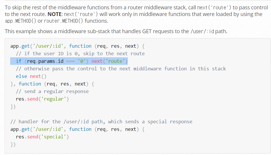 next('route') 즉 다음 라우트의 미들웨어를 실행하라는 것