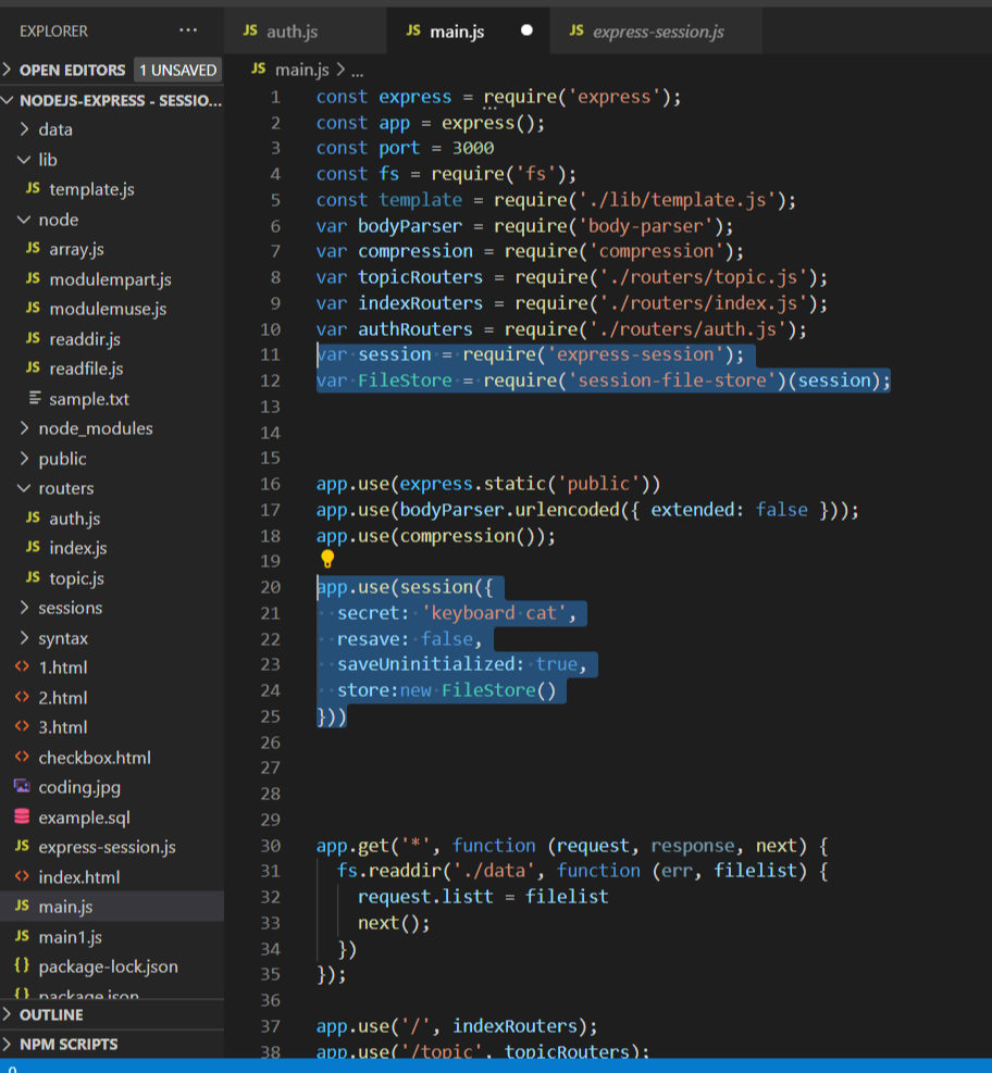3.애플리케이션에 접속할때 마다 세션이 생성되도록 세션 미들웨어 설치