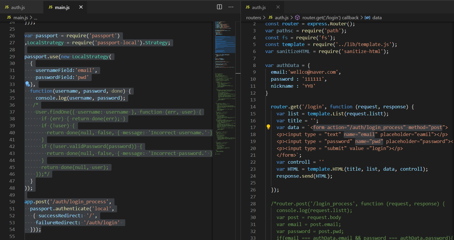 어디로 데이터를 전송하도록 되어 있냐면 routes/auth.js에서 /login_process 인데