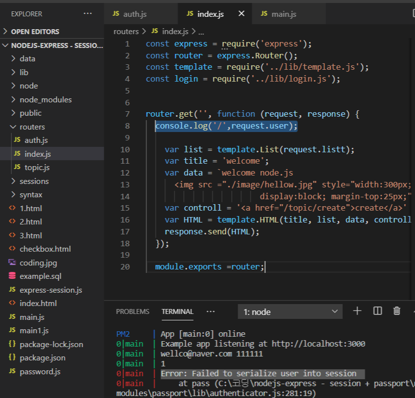 다시 로그인 해보면 Failed to serialize user into session이라는 에러 송출