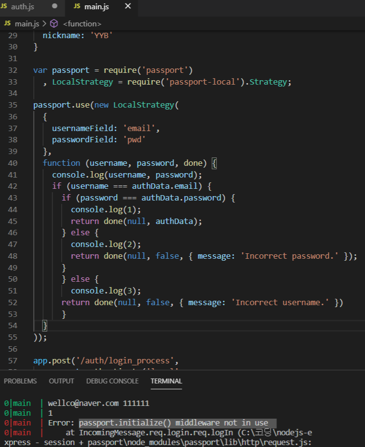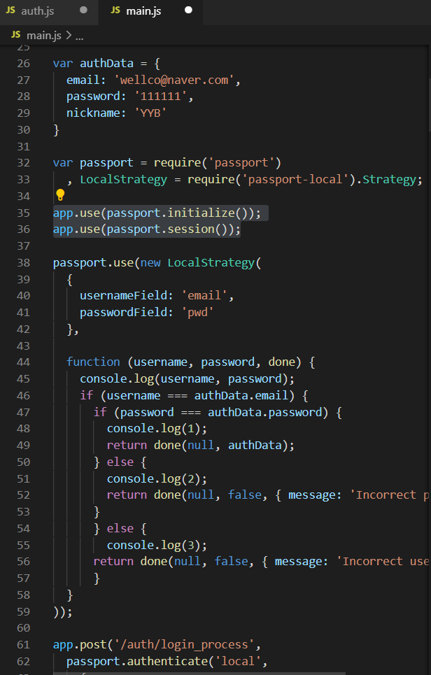 2. app.use(passport.intialize());로 express에 passport를 쓰도록 하고