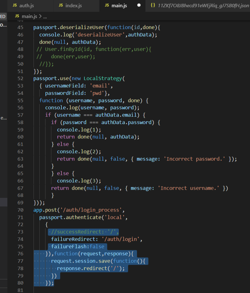 를 통해서 사용자가 전송한 정보를 passport가 받도록 했고 성공하면 '/' 로