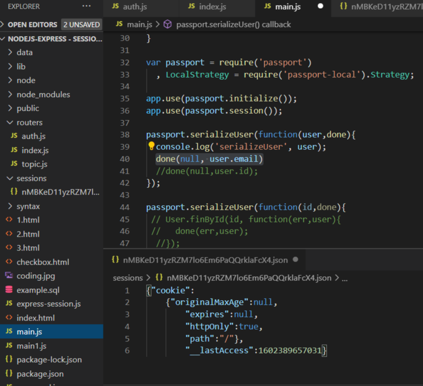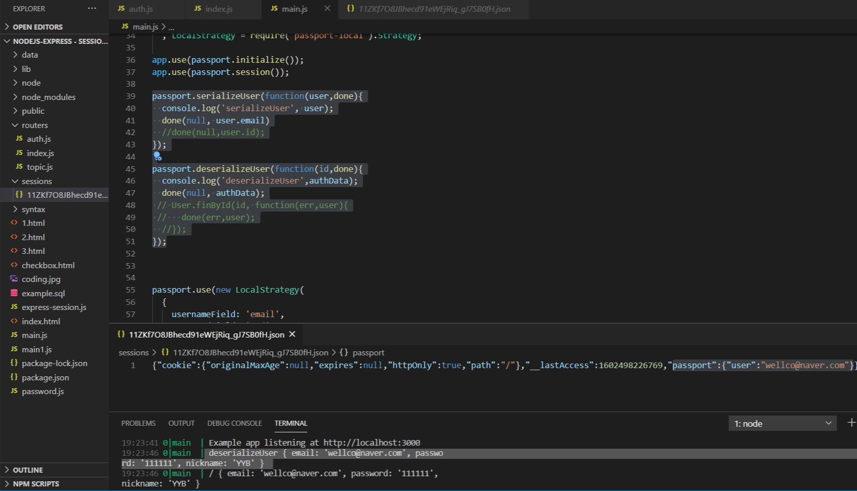 그리고 로그인을 해보면 done()함수가 실행되면서 session 폴더 안의 파일에 passport의 user값으로
