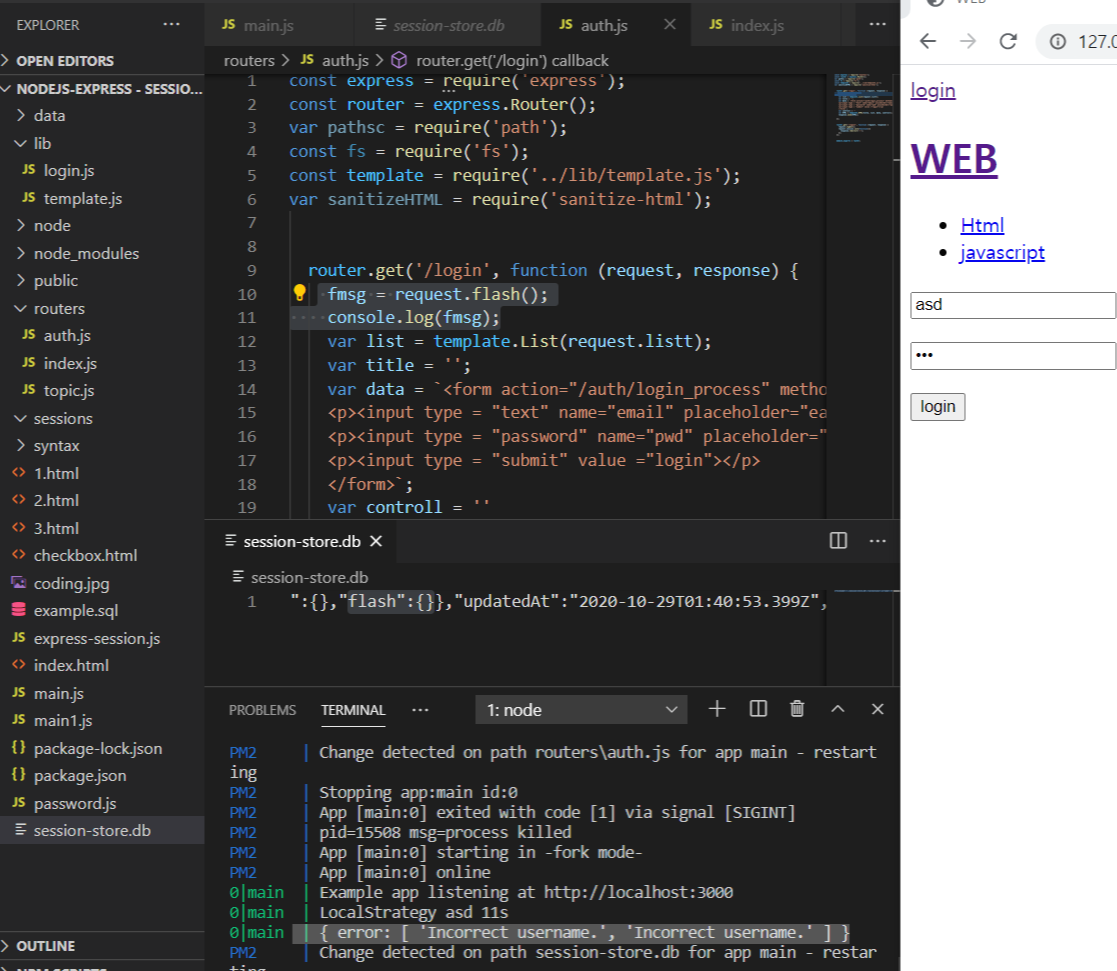 를 추가하면 세션스토어에 저장되어 있던 flash 메세지("error" : ["Incorrect username"])가 console.log에 의해서