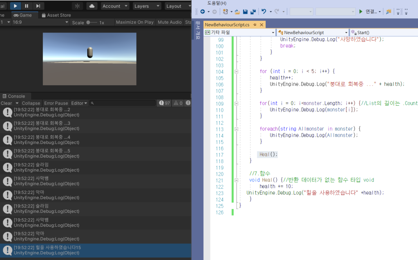 int Heal(int currentHealth){}에서 int는 리턴값의 데이터타입 int는 매개변수의 데이터 타입