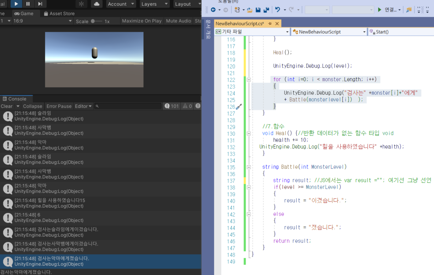 6. for문과 함수를 이용하여 한번의 호출로 배열내의 모든 몬스터들과 battle결과