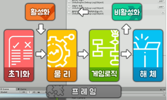 활성화- 초기화 영역과 물리연산 사이에 위치함, OnEnable: 게임 오브젝트가 활성화 되었을때