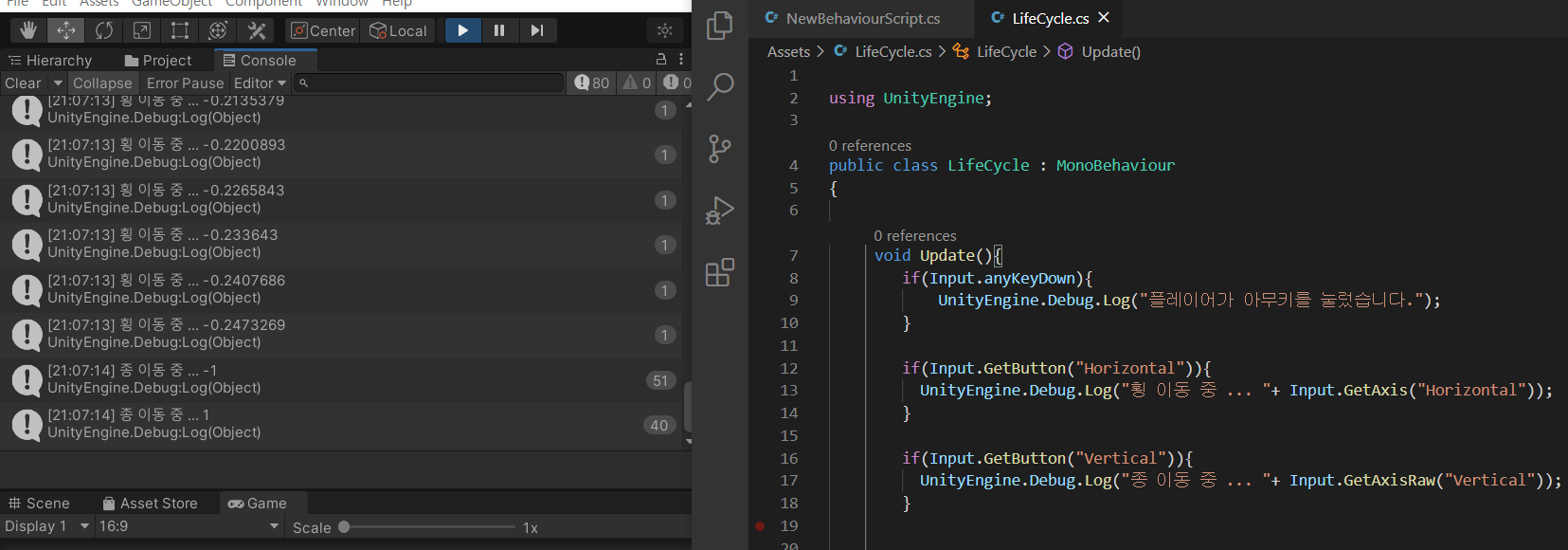 *매개변수(Axes)는 Input Manager의 유니티 자체에서 이미 설정되어 있는 입력규칙들