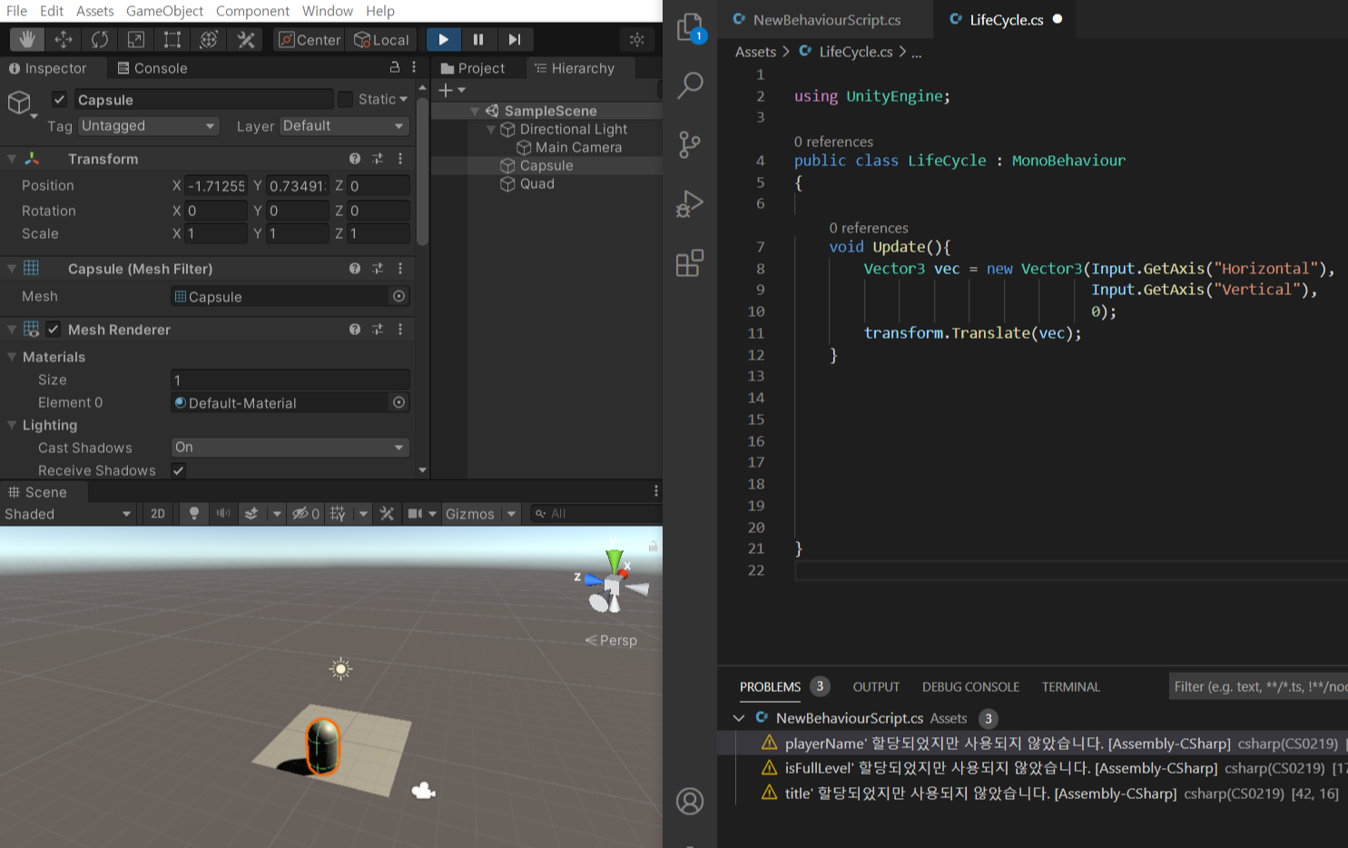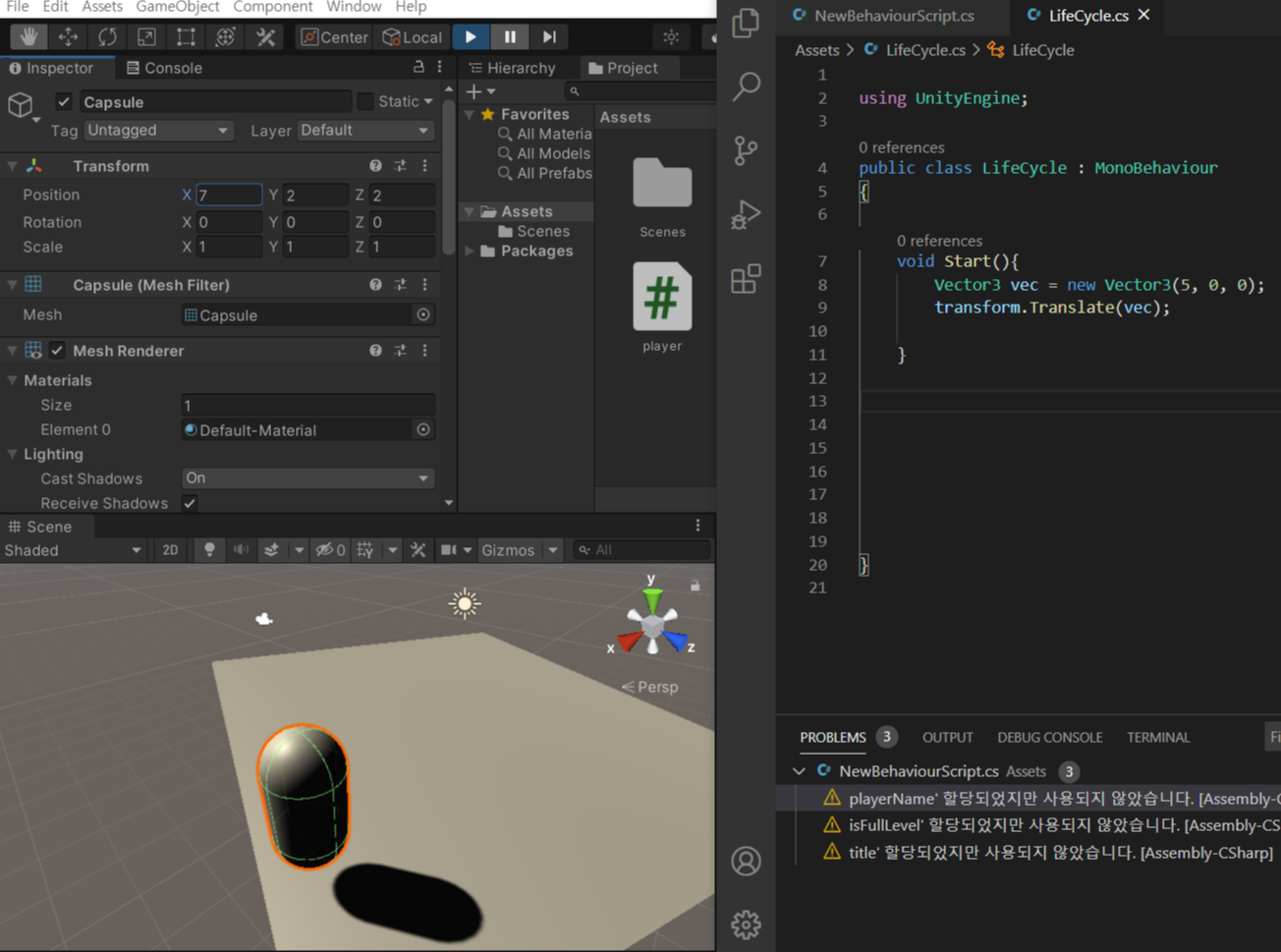 -현재위치에서 Vector값만큼 이동 transform.Translate(Vector값)