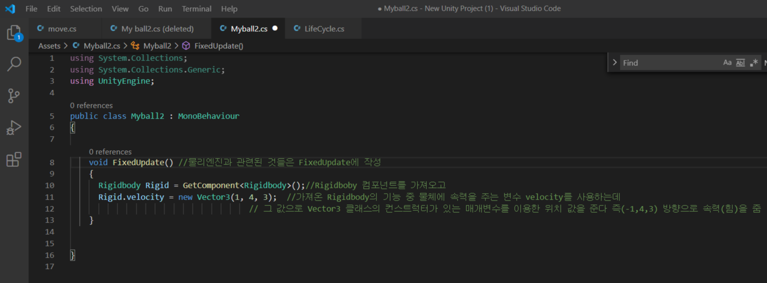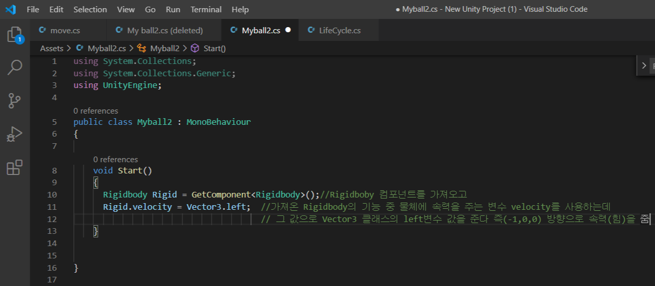 2. Rigidbody의 클래스 안의 velocity라는 변수로 물체에 속력을 줌