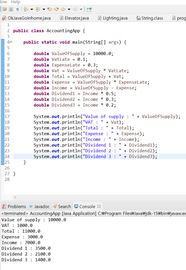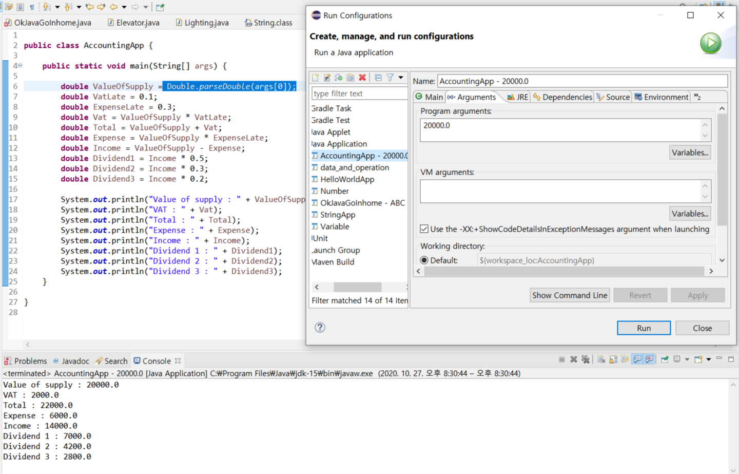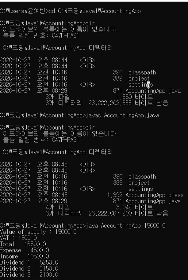 -> javac AccountingApp.java로 컴파일 -> java AccountingApp 20000.0 으로 Run