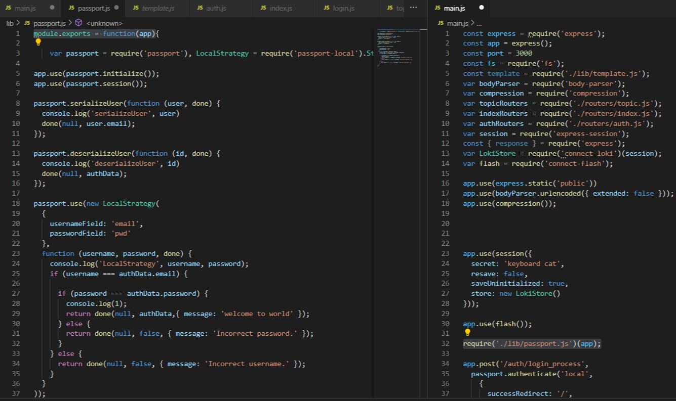 (3) - main.js와 연동시키기위해 require('./lib/passport.js') 그리고 모듈파일인 passport.js를 함수로써 exports했기때문에