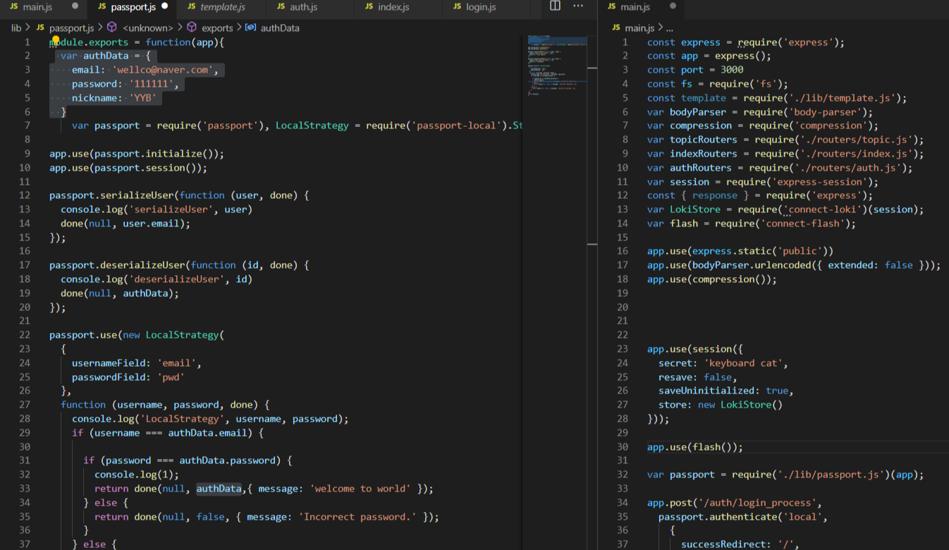 (1) -lib/passport.js 에서 사용하는 authData를 main.js에서 가져온다.