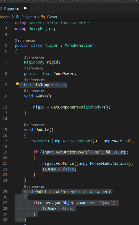 public float JumpPower; //변수선언시 자료형 앞에 public을 붙이면 유니티 엔진 내에서 변수 수정가능