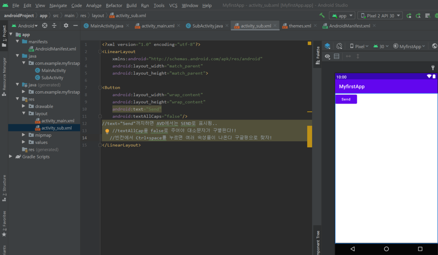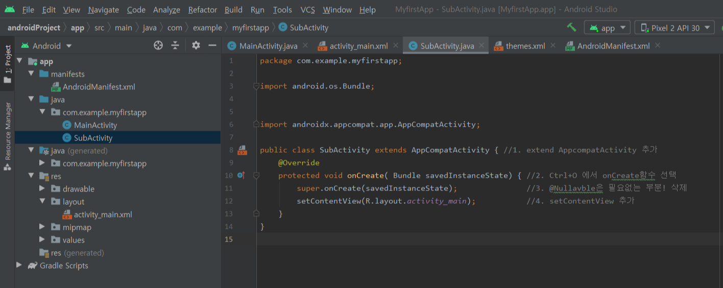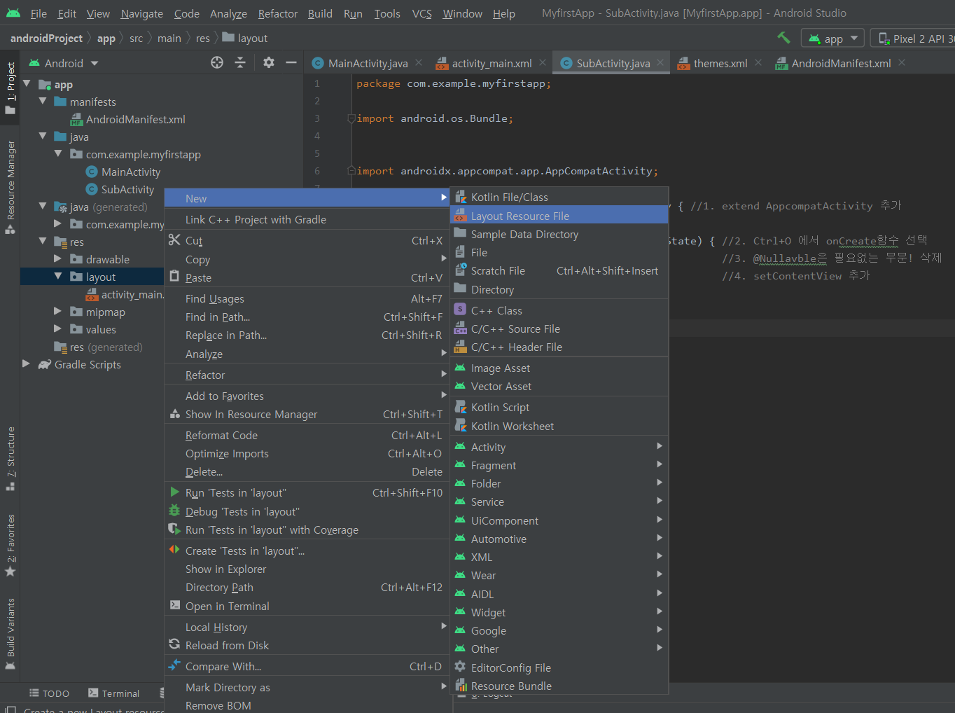 (1) - java파일 우클릭 -> new -> java class 생성 - > SubActivity 이름으로 생성