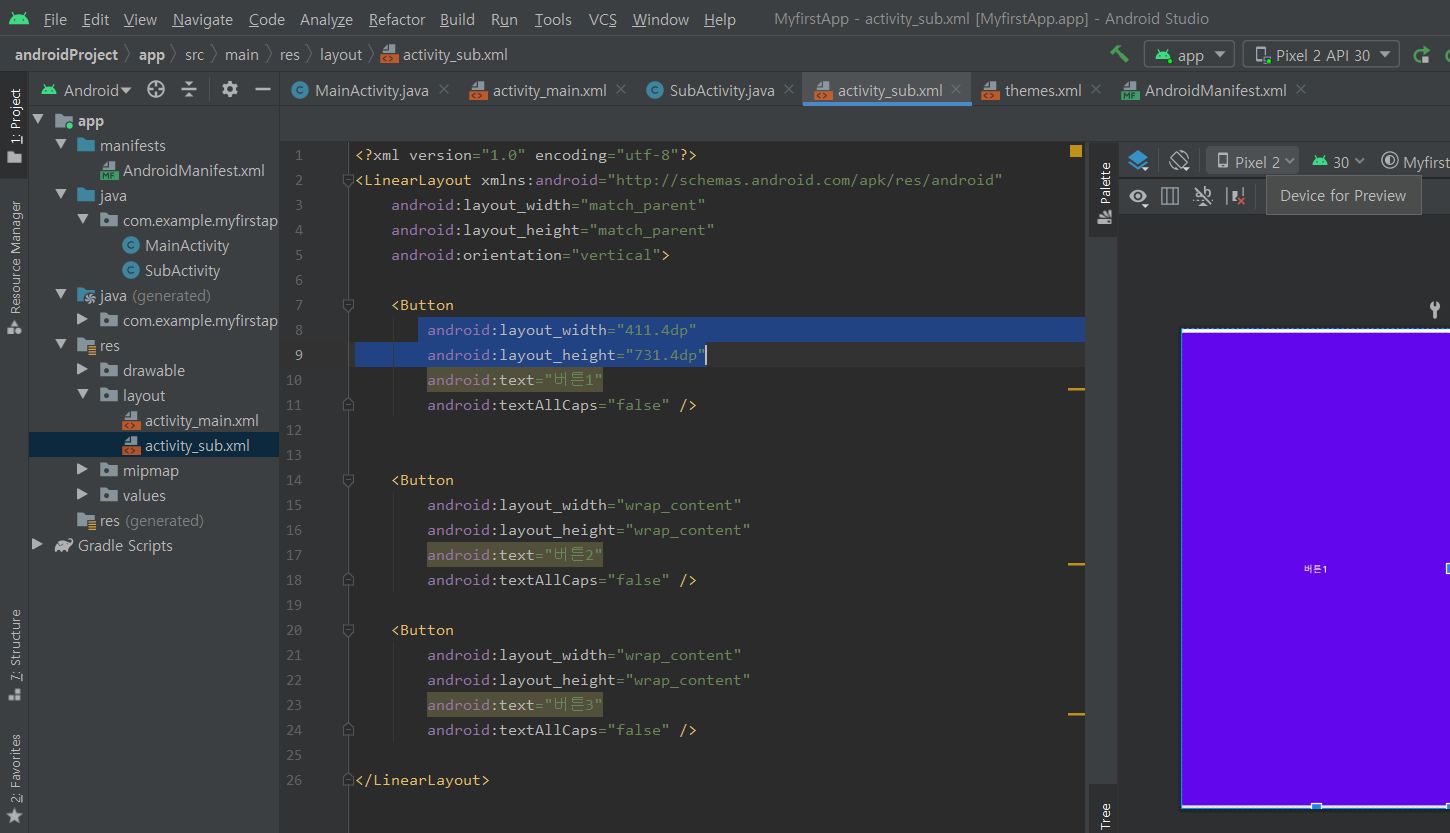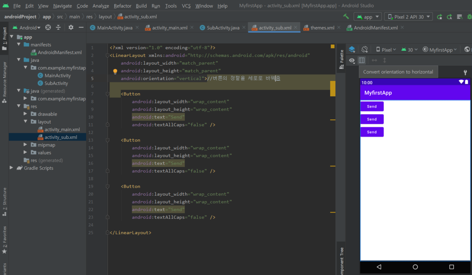 <androidx.constraintlayout.widget.ConstraintLayout> 을 <LinearLayout>으로 변경(후자방식이 배우기 쉬움)