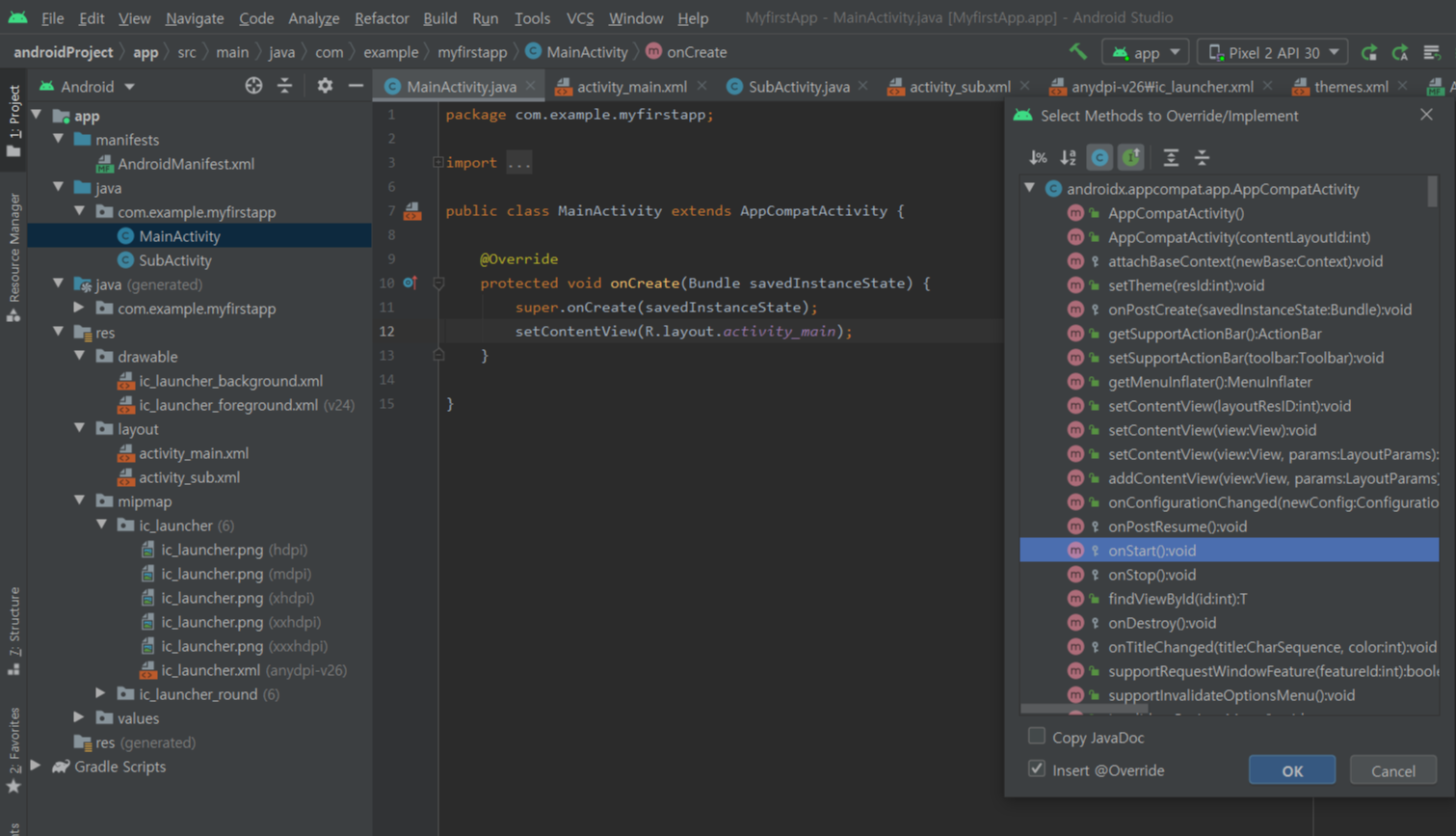상단바 code -> override Method 또는 Ctrl+O 를 누르면 여러 함수들을 호출할 수 있다