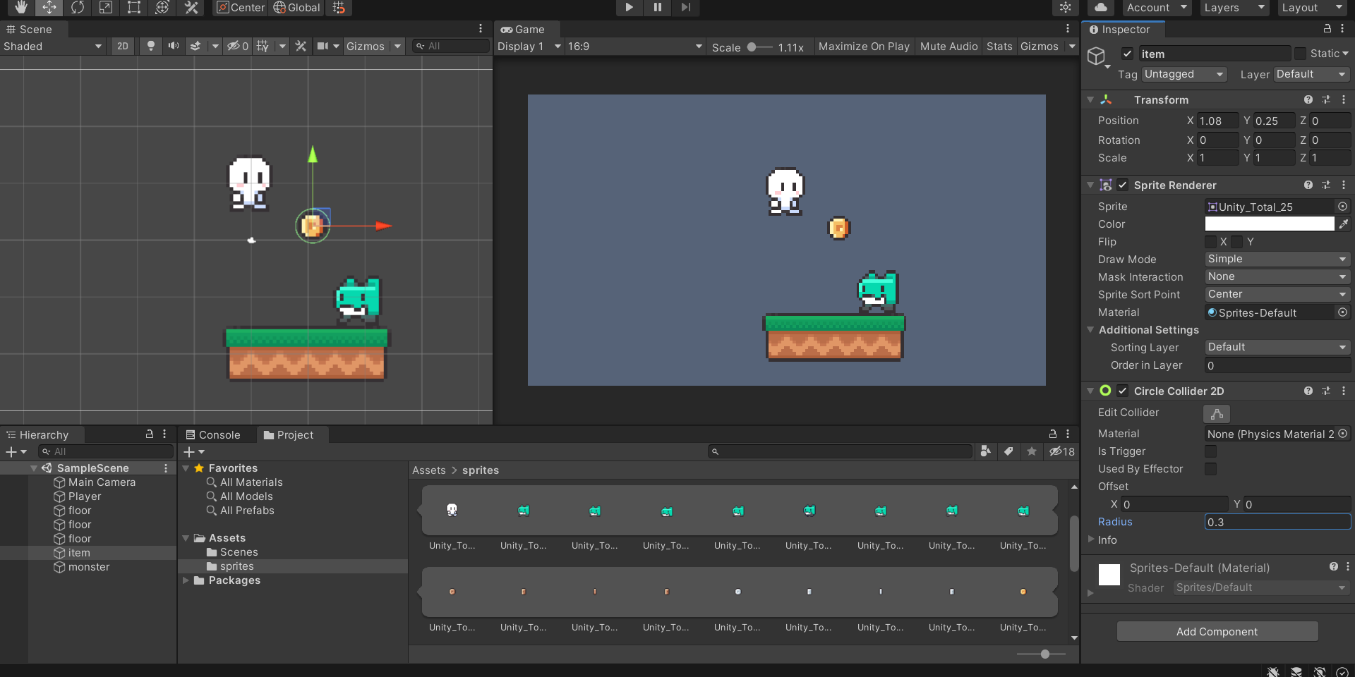 *)item은 리지드바디를 빼고 기존 박스 콜라이더에서 써클콜라이더로 바꾸고 콜라이더 지름을 조금 줄임!