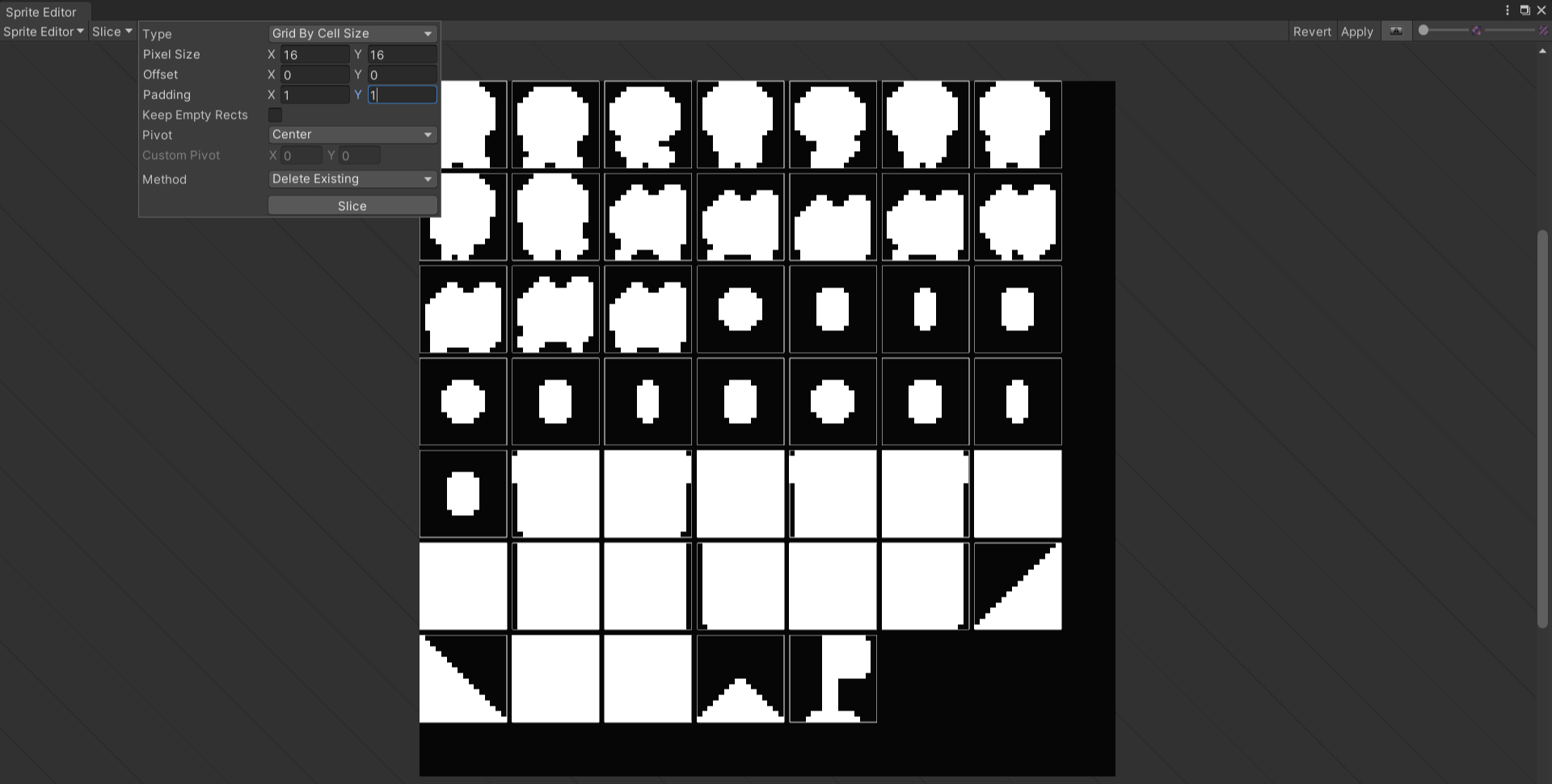 (4) - Grid By Cell Size 방식으로 각각 내부 이미지 픽셀크기인 16픽셀 그리고 패딩간격을 1픽셀로 주어서 Slice