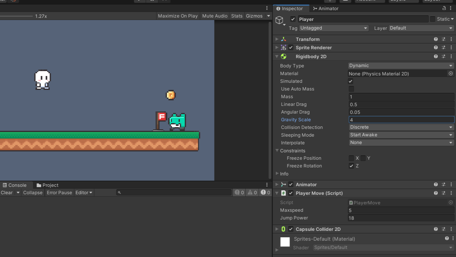 방법2 : Player오브젝트의 속성중 RigidBody2D에서 Gravitiy Scale 값을 늘려준다 이는 현재 중력에 대한 비율로