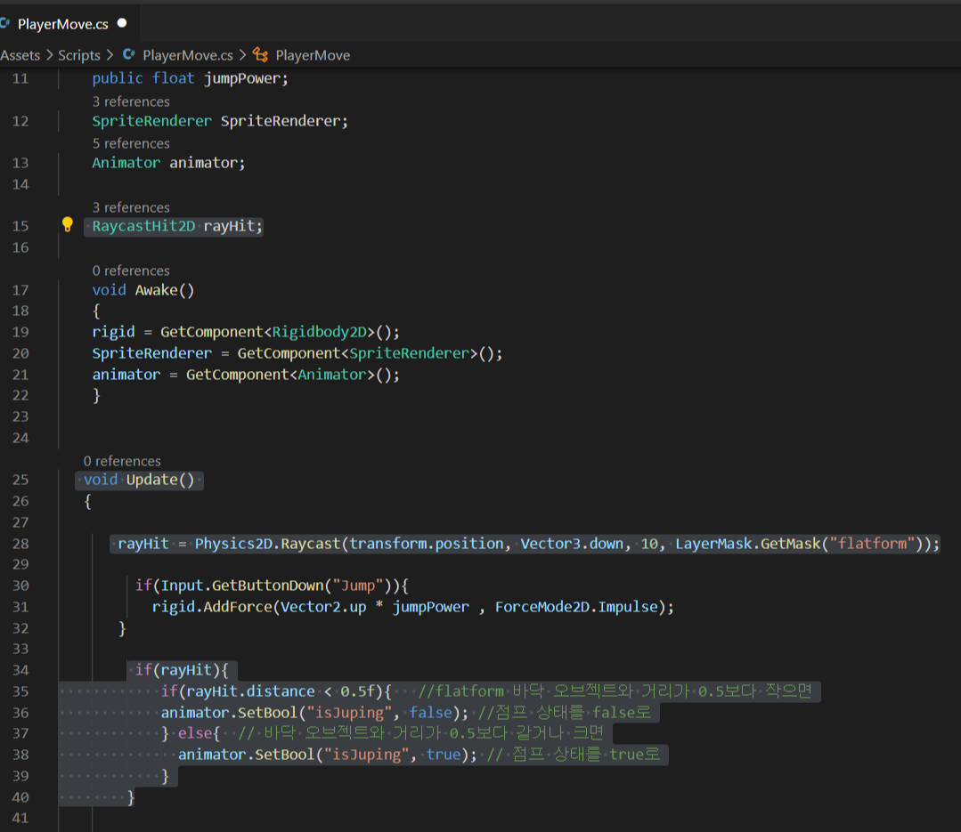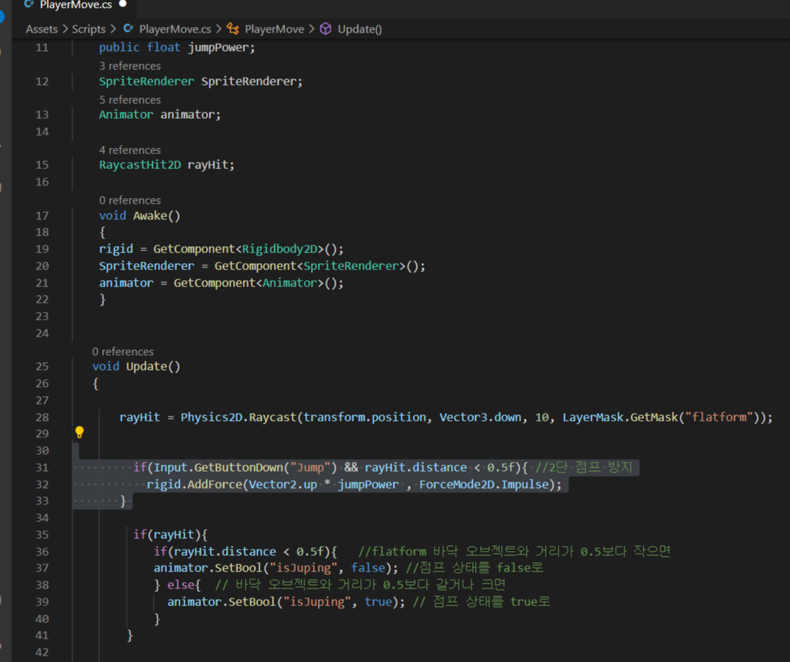 *2단점프를 방지할때도 rayHit.distance를 쓰려고하기에 update()안으로 옮겼다