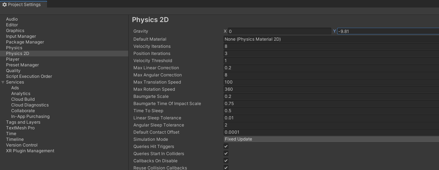 방법1: Edit - projectSettings - physics 2D - Gravity의 Y축값을 기본 -9.81에서 -25 등으로 중력가속도 값을 높게 준다
