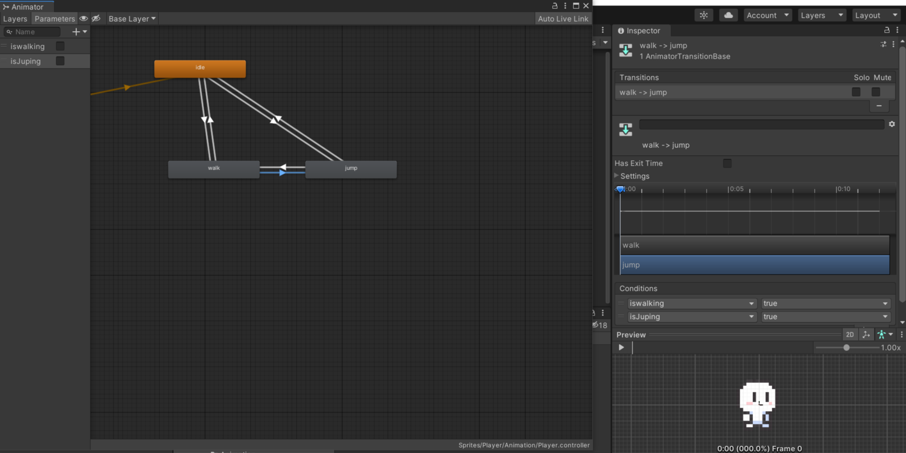 (2) - Animator에서 Paramerters에 isJuping(isJumping인데 오타 ㅎ) 생성후 새로 만든 Jump state를 idle,walk state와 연결 하고 각각 Conditions를 준다 아래는 walk와 Jump state 간의 conditions 설정 예제