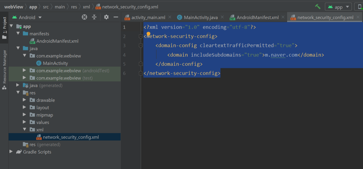 *)MainActivity에서 url을 https://www.naver.com으로 해놓았지만 직접 빌드를 해보니 모바일에서는 http://m.naver.com/ 이라고 나오면서 err_cleartext_not_permitted 오류가 발생했다