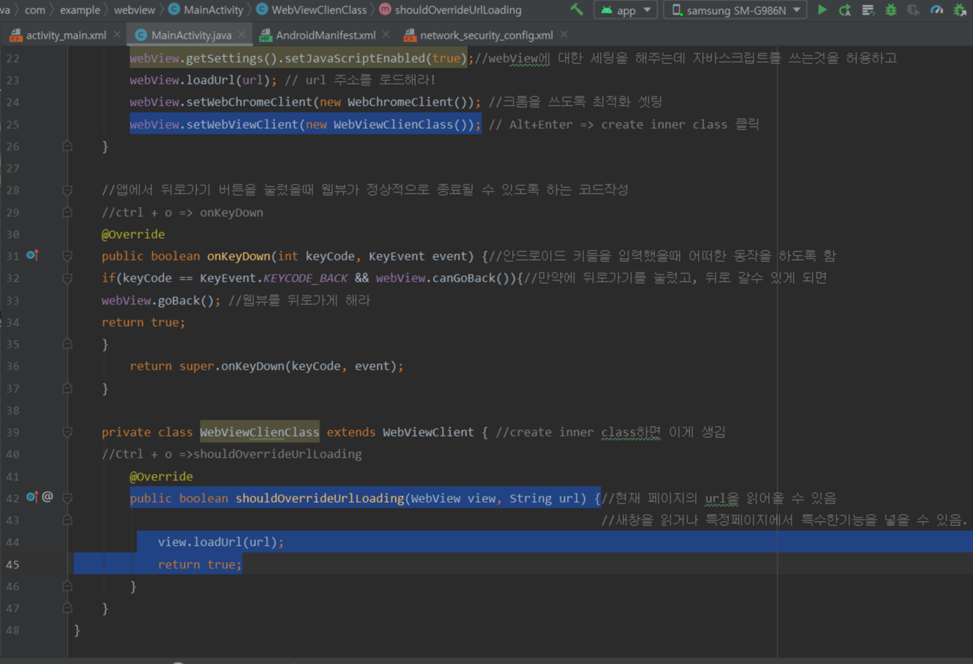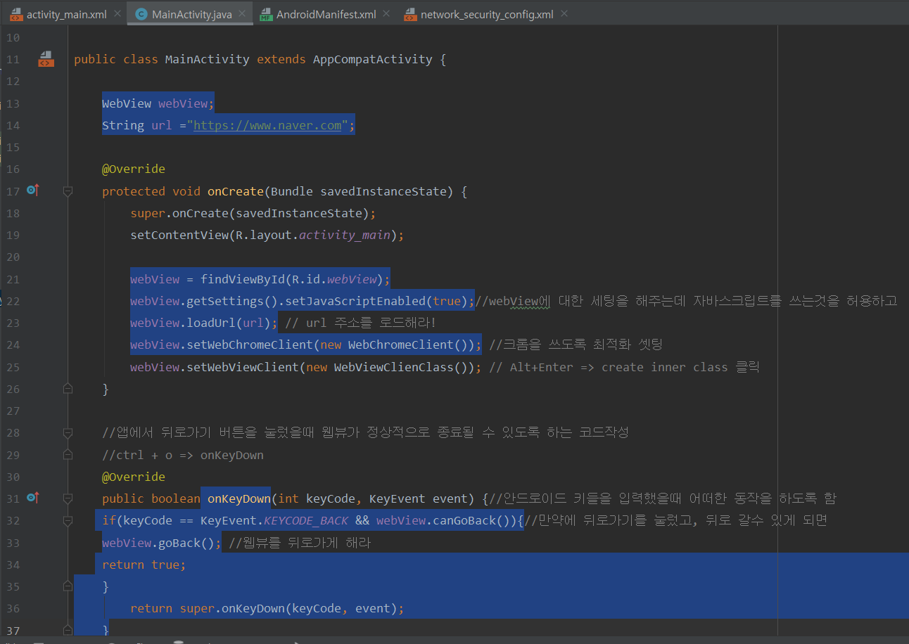 (2) - webviewClienClass를 만드는 이유는 어플을 실행했을때 새창으로 뜨지 않게 하기 위해서 이다