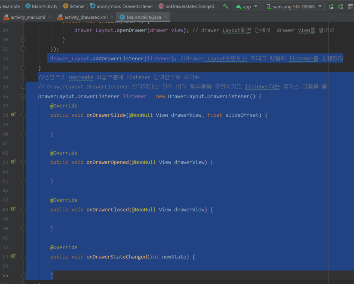 DrawerLayout.DrawerListener 인터페이스 안에 정의된 함수들이 터치슬라이드등 관련되어 있기때문에