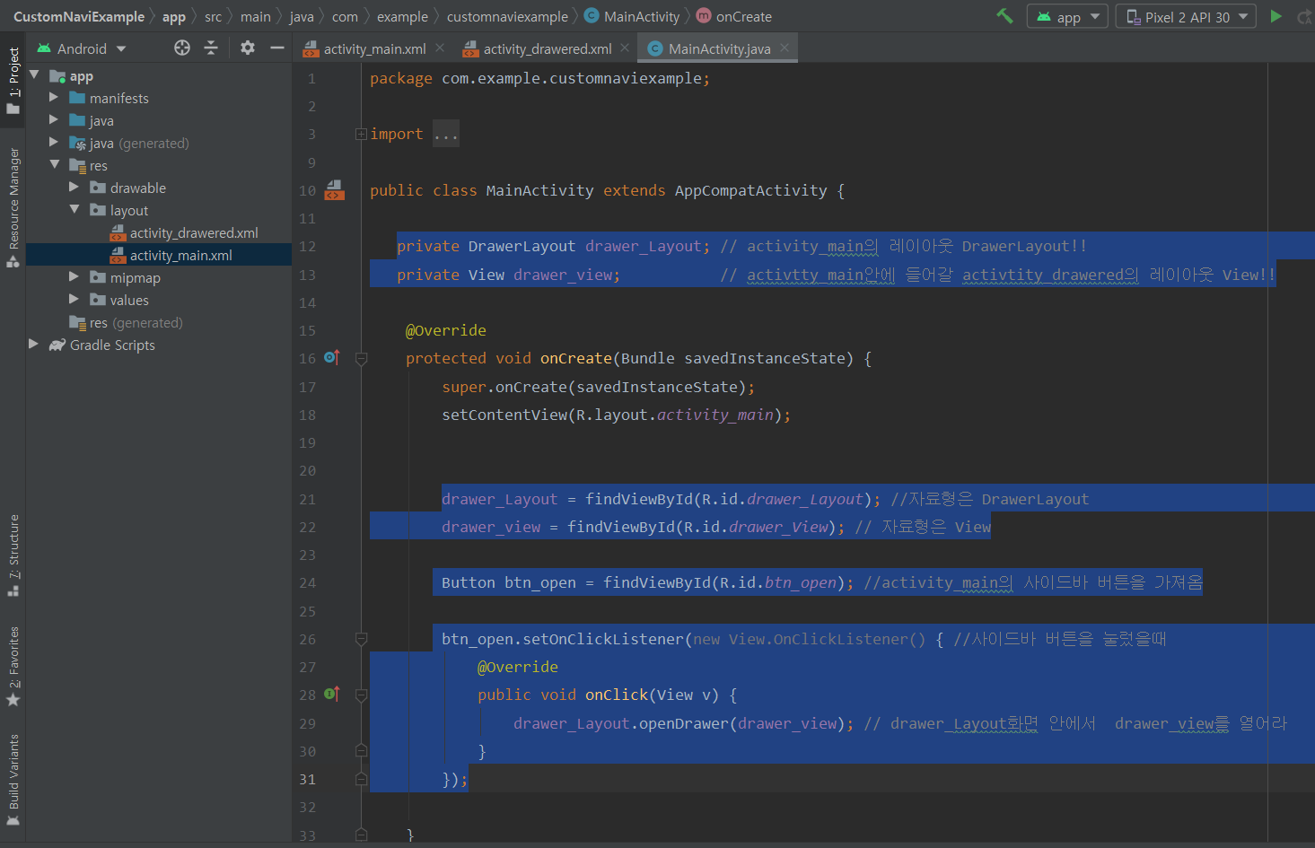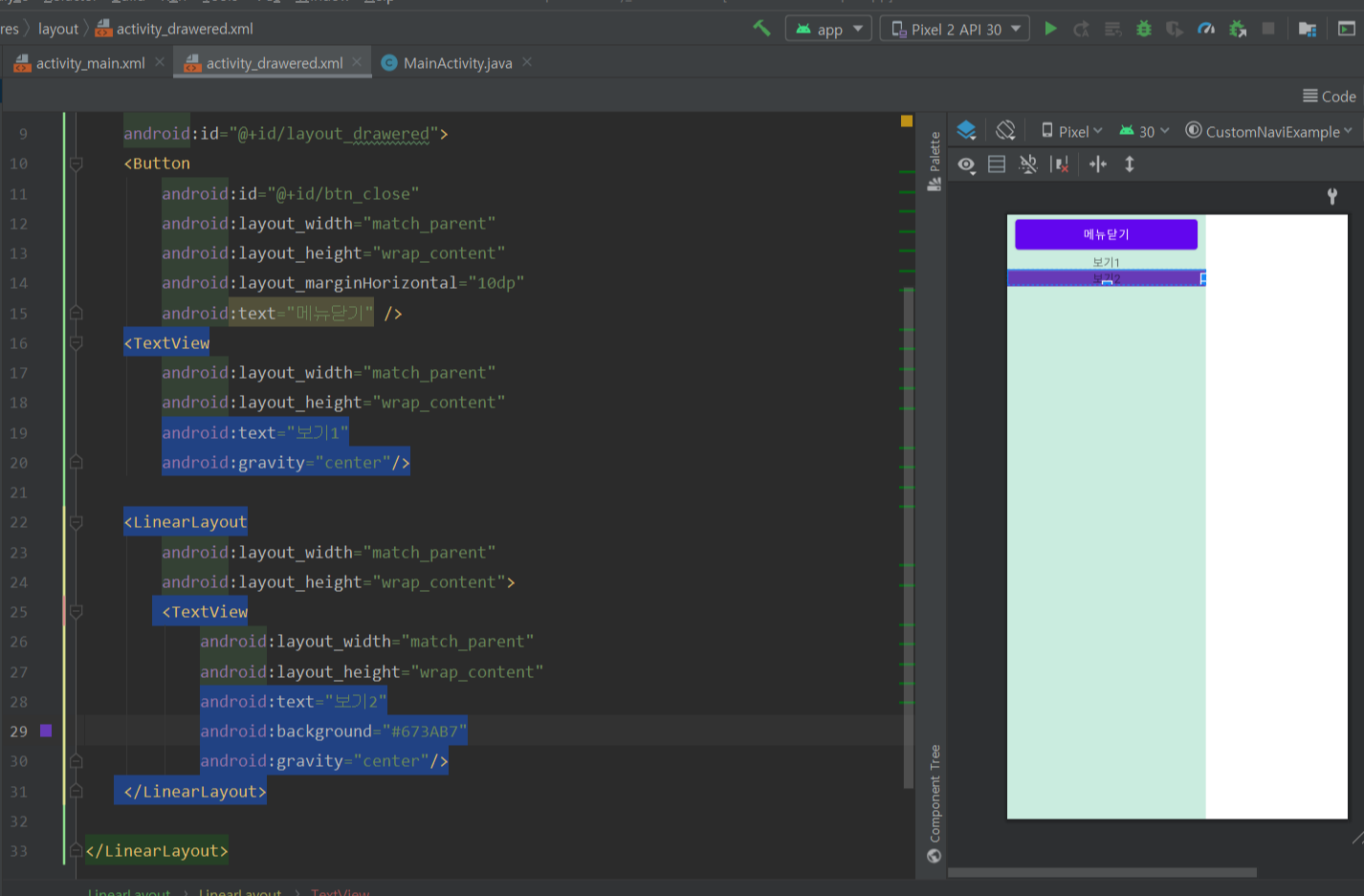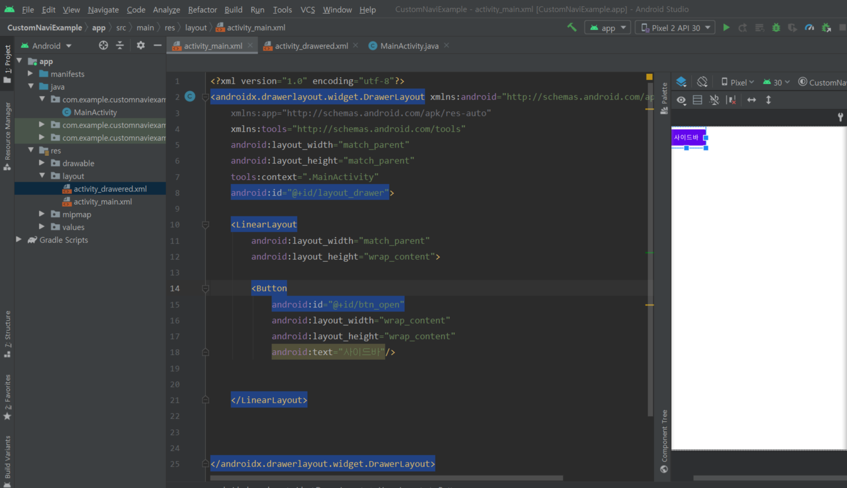1.activity_main에 DrawerLayout(위에 그림을 그릴 바탕이되는 레이아웃) 생성