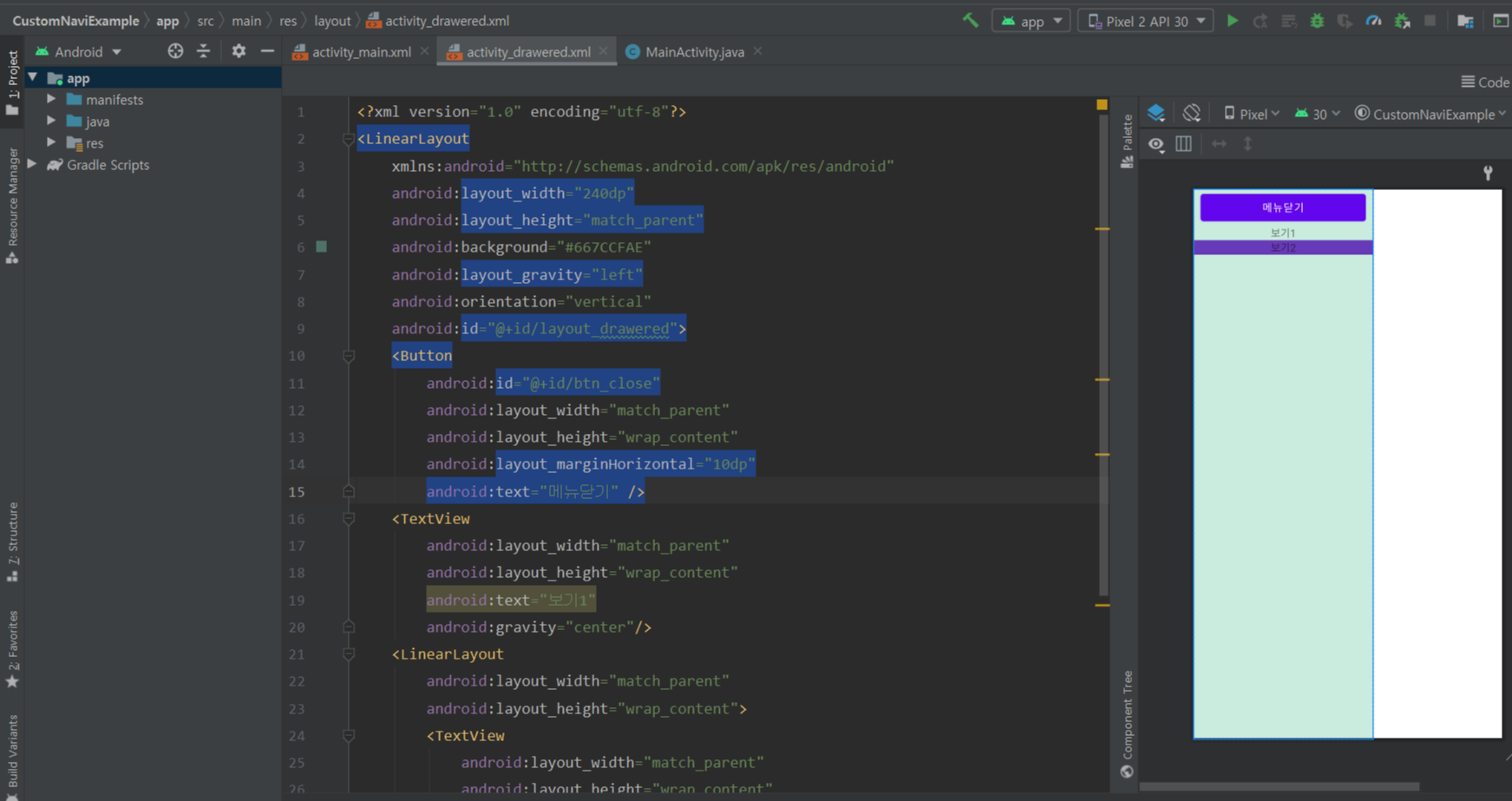 (1) - 사이드바 전체 레이아웃이 될 가로240dp의 LinearLayout 생성 및 메뉴닫기 버튼생성