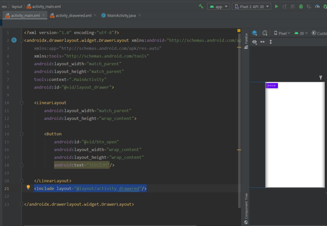 3.Include로 바탕이되는 activity_main에 그려질 activity_drawered 를 연결